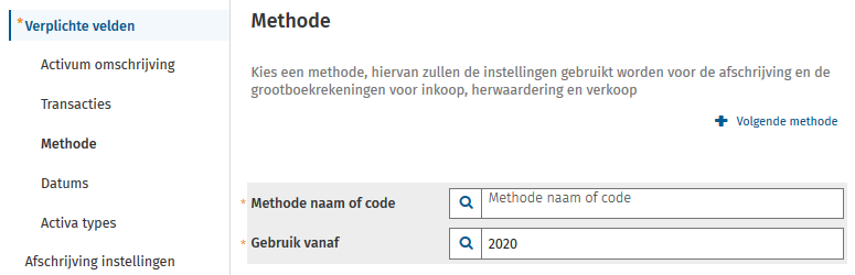 | Methode naam of code | Selecteer de methode waaraan je het activum wilt koppelen. In dit artikel lees je meer over methodes: Methodes vastleggen