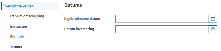 | Datum investering | Geef hier de datum op waarop de investering voor het activum heeft plaatsgevonden. |