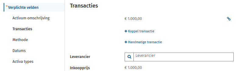 | Koppel transactie | Je kunt via deze link een boeking die in het tabblad Te verwerken staat, koppelen aan het nieuwe activum. In dit artikel lees je meer over het tabblad Te verwerken: Het tabblad Te verwerken In dit artikel lees je hoe het koppelen precies werkt: Koppel transactie |
