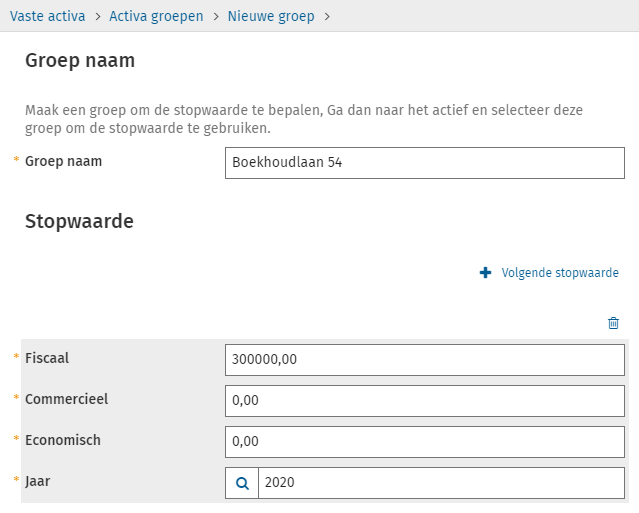 | Fiscaal | Hier vul je de fiscale stopwaarde in voor de groep. Twinfield zal stoppen met het afschrijven van de activa die je aan de groep hebt gekoppeld zodra de netto boekwaarde van alle gekoppelde activa gelijk is aan de stopwaarde van de groep. |