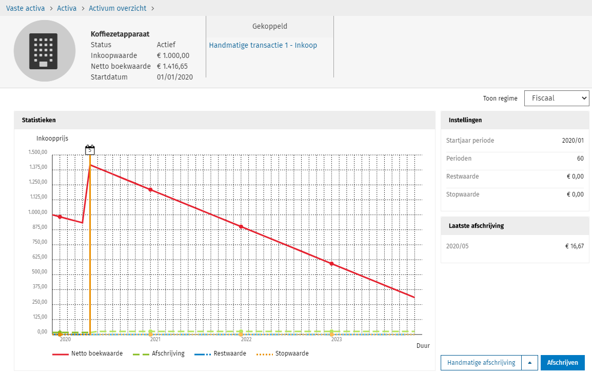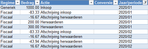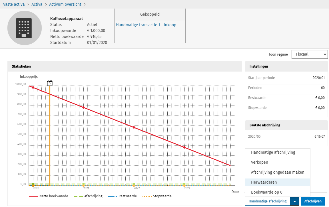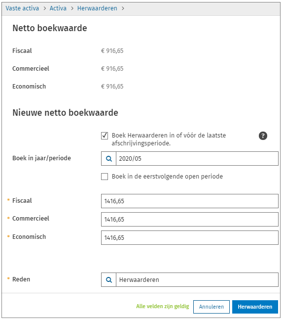 Let op: Als een activum reeds t/m 2020/05 is afgeschreven en je voert een herwaardering uit in 2020/01, dan kan het nodig zijn om reeds bestaande afschrijvingen te corrigeren.