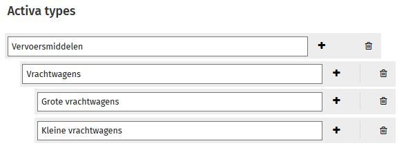 Vaste activa - IntroductieIn de activarapporten kunnen activa gegroepeerd worden met behulp van categorieën. Dit kun je vergelijken met de rapportagestructuur in Twinfield. Elke categorie wordt vastgelegd als een activa-type. Ga naar het menu Vaste activa en klik op Activa types. Er kunnen tot drie niveaus diep categorieën ingesteld worden waarop gerapporteerd kan worden. De activatypes zullen vervolgens getoond worden wanneer je een activarapport opvraagt. De schermafdruk hieronder toont een voorbeeld over hoe ze kunt instellen.