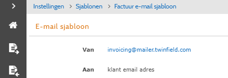 Standaard wordt bij verzenden van facturen en offertes vanuit Twinfield het volgende mailadres gebruikt: invoicing@mailer.twinfield.com