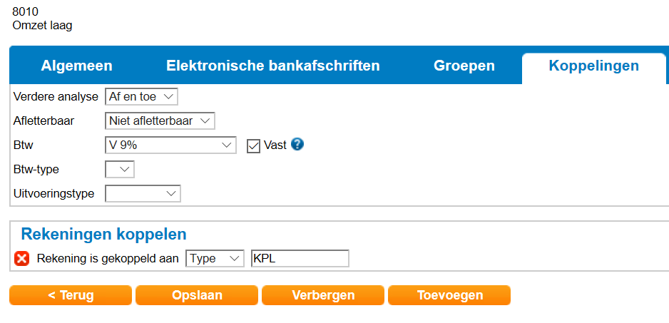 Artikel A heeft grootboekrekening 8010 ingesteld. Op deze grootboekrekening is btw-code ''V 9% - Inkoop Laag'' ingesteld en de optie 'Vast' aangevinkt. Dit betekent dat op deze grootboekrekening uitsluitend kan worden geboekt met de btw-code V 9%. Zonder het vinkje bij 'Vast' wordt V 9% voorgesteld, maar mag wel een andere btw-code worden gebruikt.