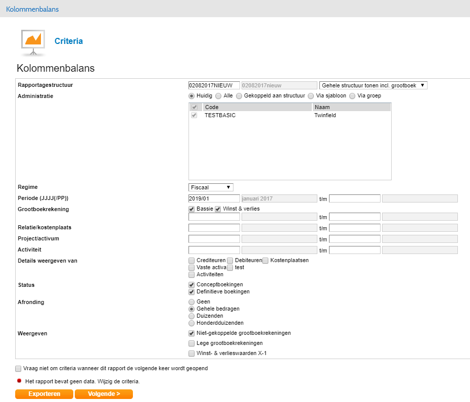 Deze melding zal worden gegeven als er geen boekingen in de administratie zitten voor de opgegeven periode in combinatie met de overige criteria.