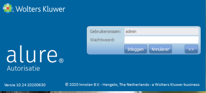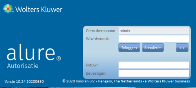 voor het inloggen in Autorisatie.De gebruiker(s) voor het inloggen in Alure zullen een eigen wachtwoord hebben en kunnen dit wel wijzigen: