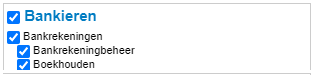 - Bankrekeningbeheer: toegang tot overzicht bankrekeningen, de mogelijkheid een bankrekening toe te voegen en een bankkoppeling in te stellen. Standaard beschikbaar voor alle rollen.